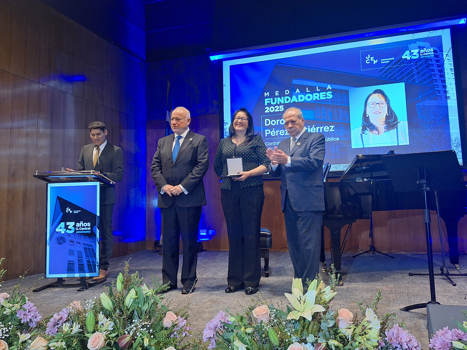 En una solemne ceremonia que contó con la presencia de las más altas autoridades, la Universidad Central celebró sus 43 años de existencia. En la oportunidad, el Rector Santiago González y el Presidente de la Junta Directiva, Patricio Silva, entregaron la “Medalla Fundadores” a la Contralora Dorothy Pérez, una distinción creada para honrar a personalidades que encarnan los valores y vocación de servicio público de la institución.